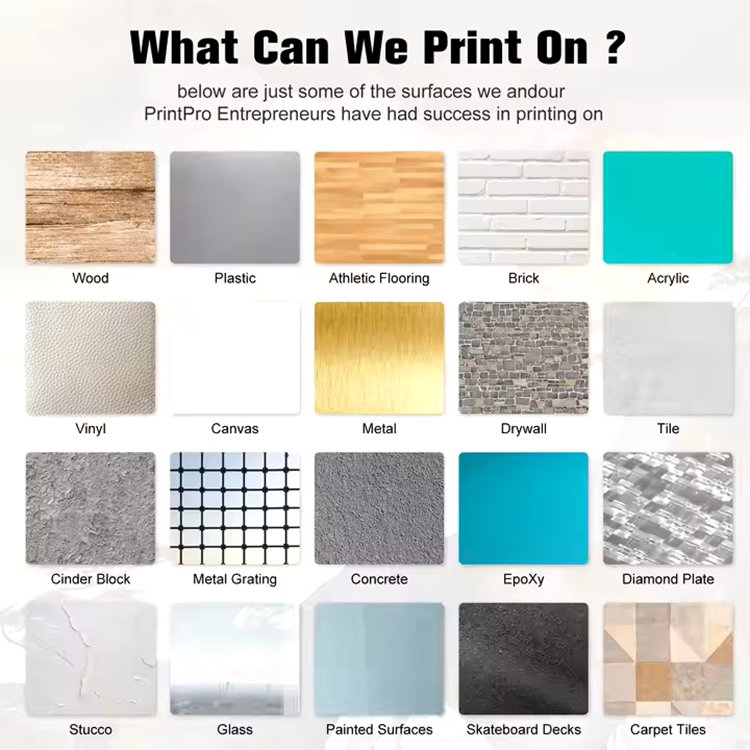 Unser Gerät kann auf fast allen nicht saugenden Untergründen drucken, z.B. Wand, Ziegel, Beton, lackiertes Holz, Glas, Acrylglas, Metall, Kunststoff, Leinwand, Aluminium und auf verschiedenen Arten von Gegenständen, z.B. Schrankfronten, Türen, Fliesen, Tische, Garagentore, Duschglas, Jalousien.